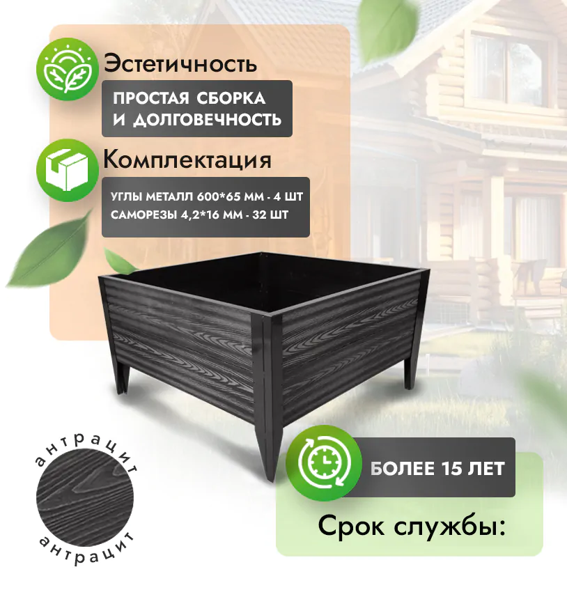 • Комплект грядок ДПК прослужит минимум 15 лет даже в самых агрессивных условиях.