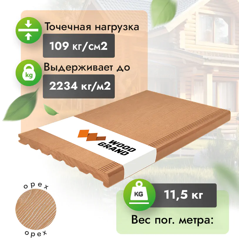 Наши ступени из ДПК выдерживают до 3318 кг/м2, влагостойкие, не требуют ухода.