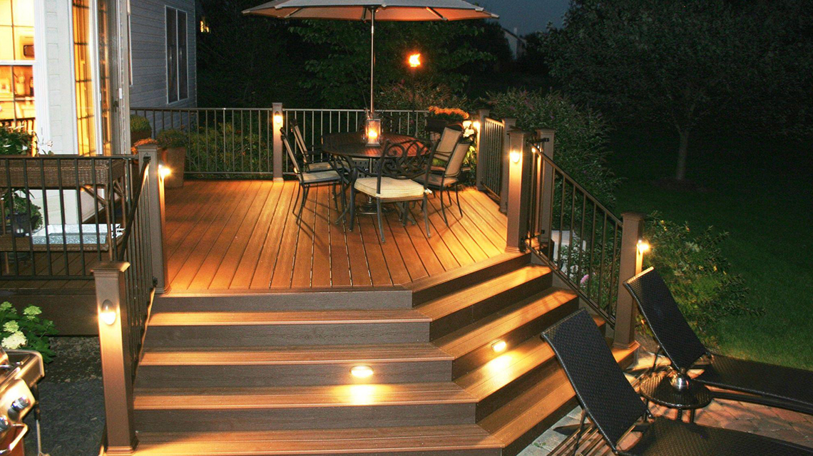 1. Освещение в покрытии: Встроенные светильники в террасную доску создадут уютную атмосферу вечером, а также обеспечат безопасность передвижения в тёмное время суток.