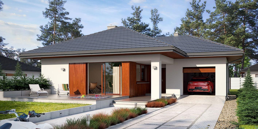 - Проект одноэтажного дома с гаражом и террасой